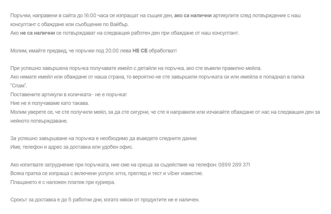 Име, телефон и адрес за доставка или удобен офис. Ако изпитвате затруднение при поръчката, ние сме на среща за съдействие на телефон: 0899 289 371